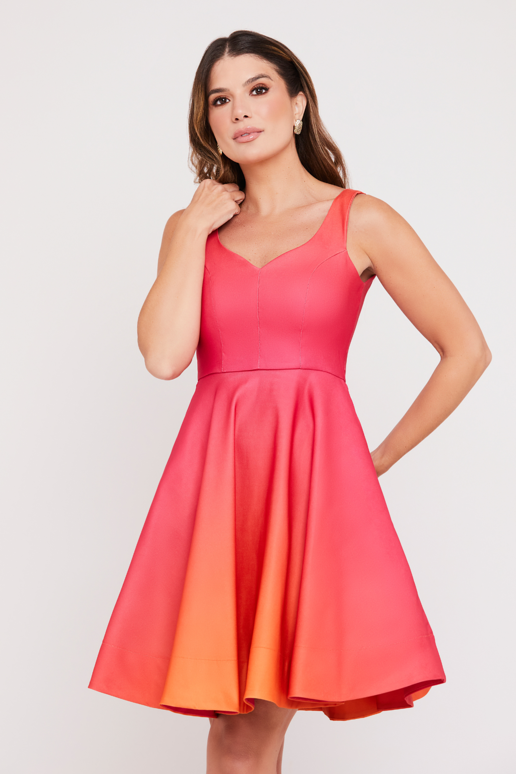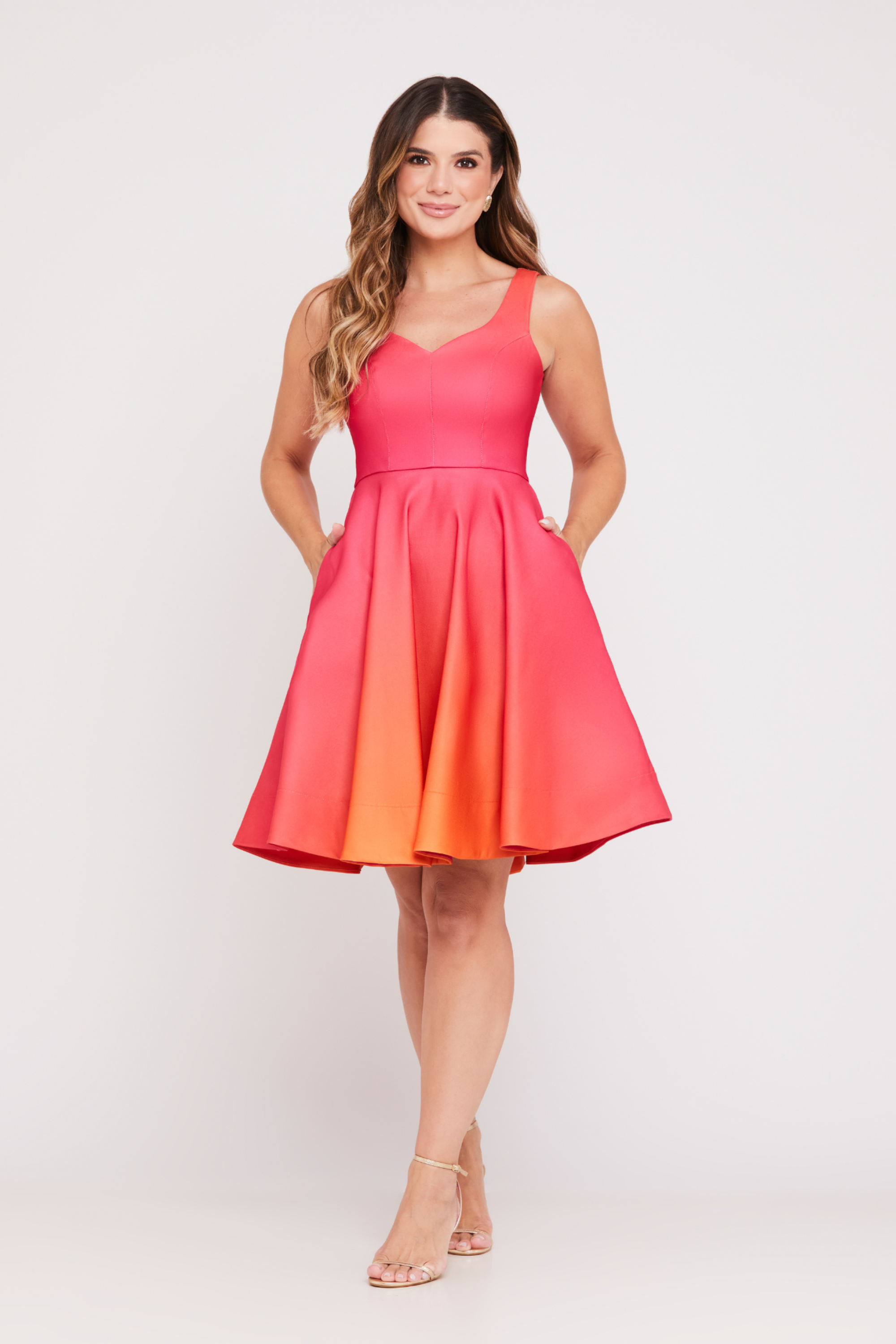 O Vestido Big Apple traz uma estampa exclusiva em degradê que começa no amarelo suave e evolui para tons de laranja e vermelho, remetendo às cores de uma maçã madura — uma homenagem à Big Apple, inspiração da coleção.